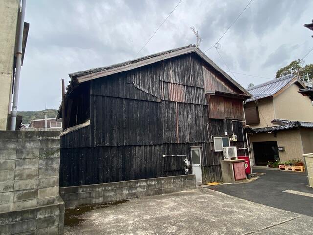 路地裏に潜む格安の戸建物件。正面の淡い色合いと黒い板壁のコントラストが魅力的だし、そこに設置された赤い防火ホースが抜群の存在感で大変よき。アジト感ある勝手口の小さな扉が良いので正面玄関は潰す作戦で。