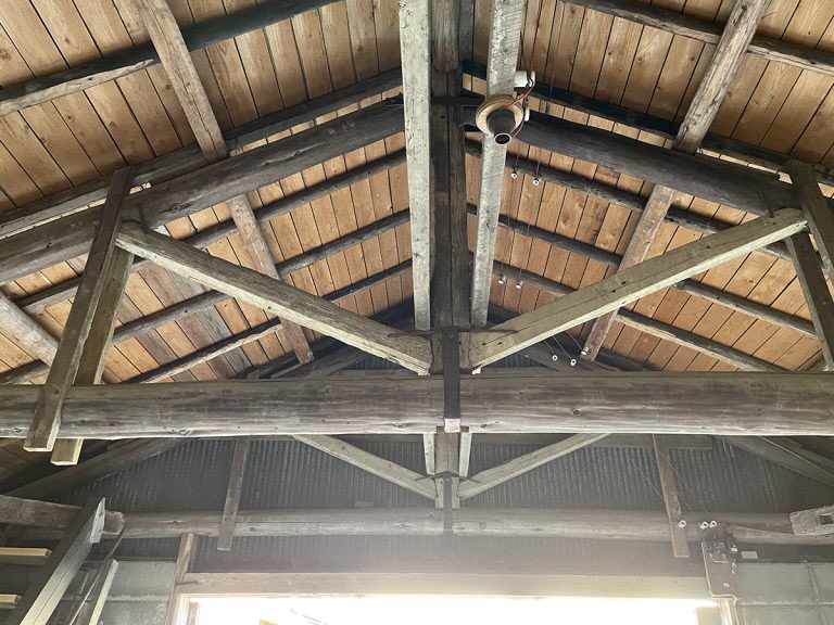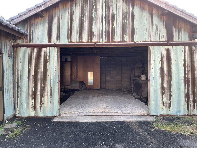 トタンの錆び具合がたまらない倉庫物件。広い開口と無骨で飾らない空間は実用第一主義の証拠でそそられるし、木組みの天井やザックリした床はリノベの意思をかき立てるそれ。裏に土地が広いので増築するのも吉。