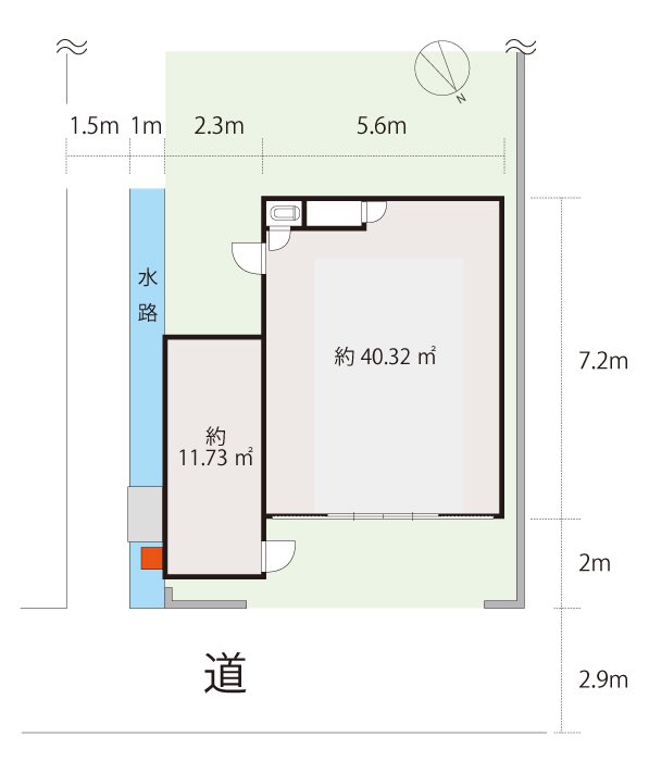 平面図はこんな感じ。横っちょの物置を壊せば奥まで車で行けるかも。