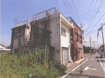 競売物件だから内覧できないし立ち退き交渉も必要だけどキューブ状の外観はシンプルで良いし廊下で2棟つながれたような作りも面白い。
