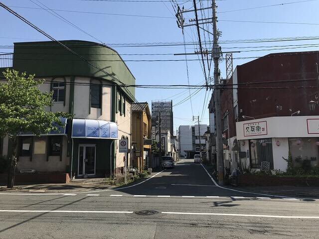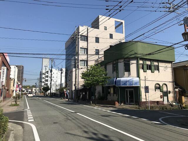 見通しのよい角地に建つ元店舗物件。緑の帽子をかぶった屋根とかコーナーのR部分とか見どころいっぱいなので、レトロファンの方おひとついかがでしょう。2階に住めそうだし街路樹もうまくマッチして良き。