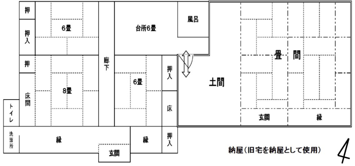 間取り上で土間がある区画は離れ。現在は納屋として使われてるけど、大黒柱とか太くてたくましいし、作りが良さそう。いずれリノベしてモダン要素を取り入れた母家にしたい。